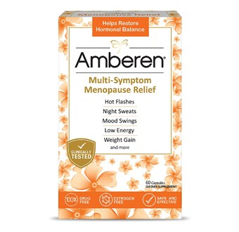 Amberen Menopause is an OTC menopause-relief supplement designed to reduce common symptoms, including hot flashes, night sweats, mood swings, low energy, weight gain, stress, irritability, low sex drive, joint aches, sleeplessness, headaches, and difficulty concentrating.