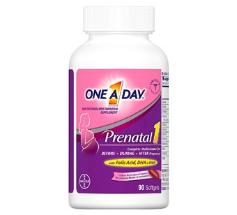 One a Day Women’s Prenatal 1 with Folic Acid, DHA & Iron can be found in most stores and provides all the essential nutrients with some extras for you and your baby.