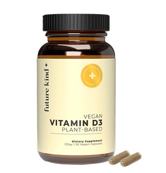 Future Kind Vegan Vitamin D3 is a simple vegan capsule that provides just above the daily recommended maintenance dose of vitamin D for most healthy adults.